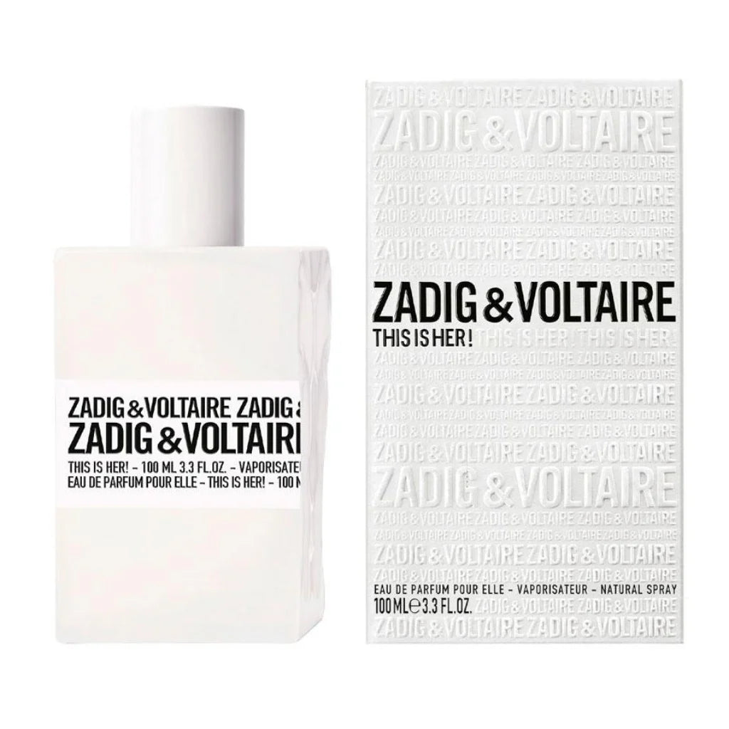 Zadig & Voltaire's "This is Her!" perfume is a captivating fragrance designed for women. It is known for its modern and rebellious character, embodying the brand's edgy and rock 'n' roll spirit. The fragrance opens with delicate floral notes of jasmine and pink peppercorn, creating a soft and feminine aura. As it develops, the perfume reveals a warm heart of chestnut and vanilla, adding a touch of sweetness and depth. The base notes of sandalwood provide a sensual and earthy foundation, leaving a lasting impression. "This is Her!" is a perfume that exudes confidence and individuality, making it a popular choice for those who appreciate bold and distinctive scents.